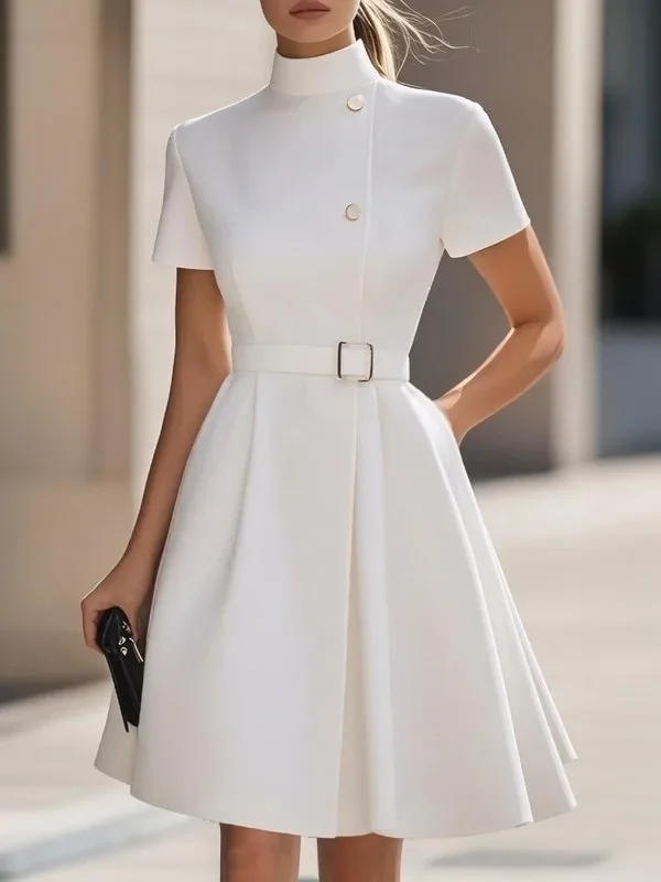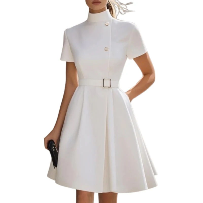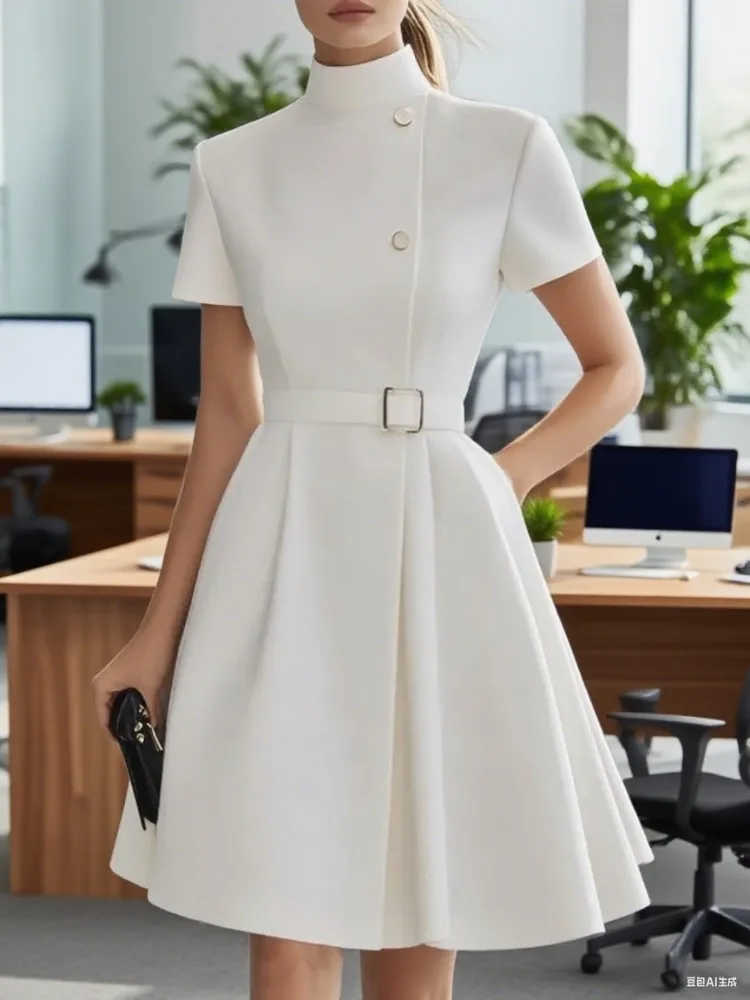 UOOZEE Office Lady High-Neck Belted Formal Commute Dress 2025 New Short Sleeves Solid Color Elegant White A-line Mini Dresses